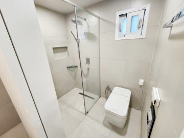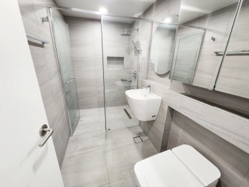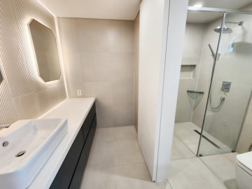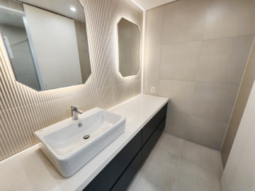 • Key Highlights: Sleek designer kitchen with high-end appliances, a spa-like bathroom with rain shower, and a spacious master bedroom featuring a custom wood-panel headboard and integrated lighting.